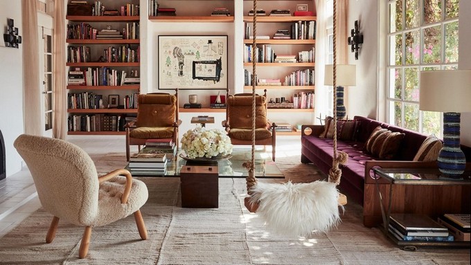 “I’m having a mid-life crisis of sorts, but I haven’t reached my mid-life point,” laughed Simone. Christina Aguilera, Miley Cyrus, and Nicole Richie, among others, have showcased Simone’s fashion work, but many would recognize her first as the stylist who was with Kim Kardashian in Paris the night of that horrific robbery. “After getting off the plane after what happened, all I wanted to do was just come to my house,” remembers Simone. “It always just felt comforting. I never felt weird after that about the security or anything … Just because my house, you know, it’s your safe place.” The 1920’s Spanish-style home in question is certainly calming and comfortable (and beautiful, to boot). It was Simone’s first solo design project, and she’s since started to take on clients, many who were inspired after visiting her home. In the living room, Simone painted the original sausalito tiles with white epoxy to keep the colors airy and soft in contrast to the eggplant velvet couch. Custom shelves holding Simone’s reference books also match the wood of the beams above for a neutral effect.