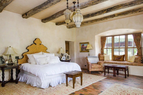 Eclectic influences pervade a sunny bedroom in the actress’s New Mexico ranch, where a mix of lanterns hang from the ceiling and a sculptural headboard grounds the bed.