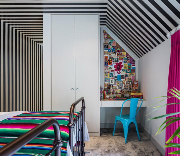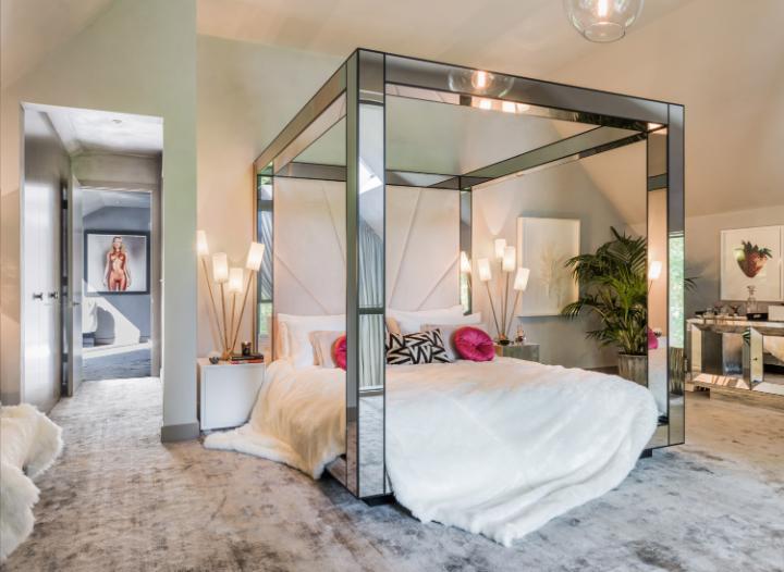 What this translates to is cosy, velvet sofas handpicked by the model, a mirrored four-poster bed and a black-and-white stripy guest room with pink curtains and Peruvian bed covers. There’s even a few framed photos of Moss on the walls to remind the buyer of its designer.