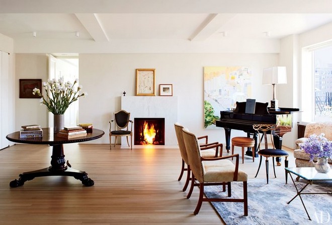 The Manhattan residence of Isaac Mizrahi was converted from three contiguous apartments by David Bers Architecture. A 19th-century pedestal table from O’Sullivan Antiques anchors the living room; the two Ole Wanscher armchairs are from Karl Kemp Antiques, and the rug is by Fort Street Studio.