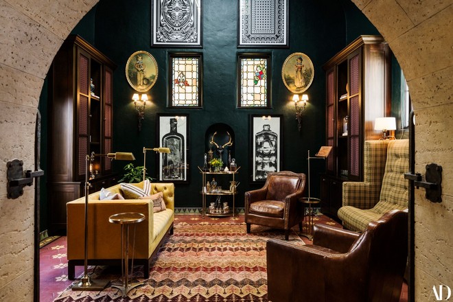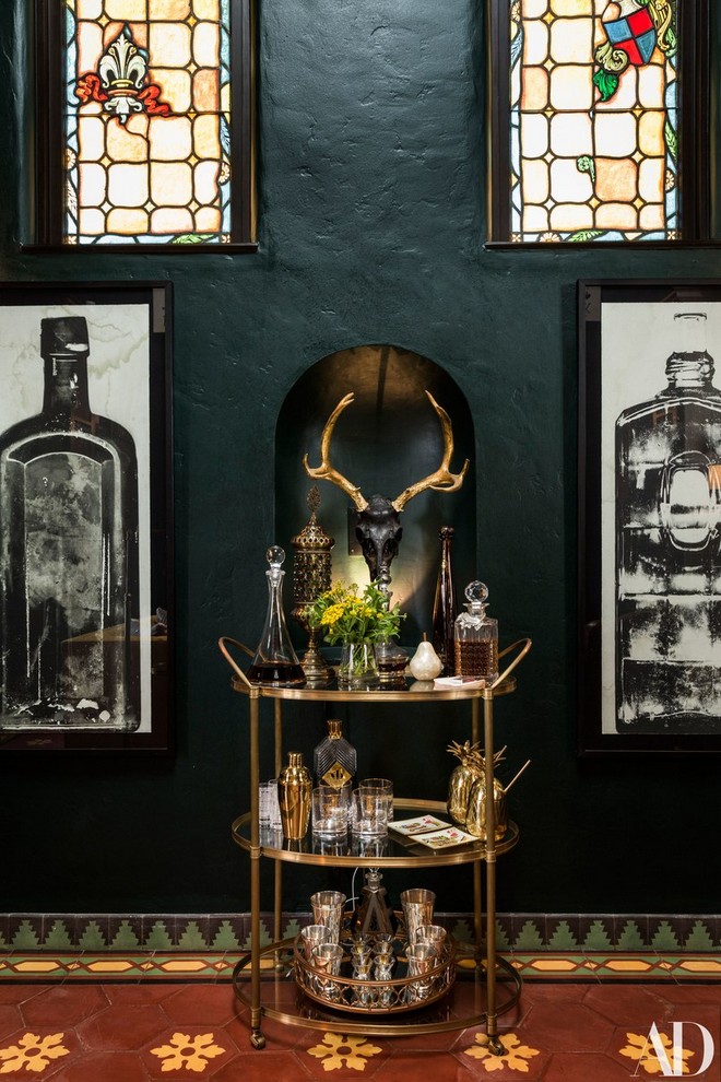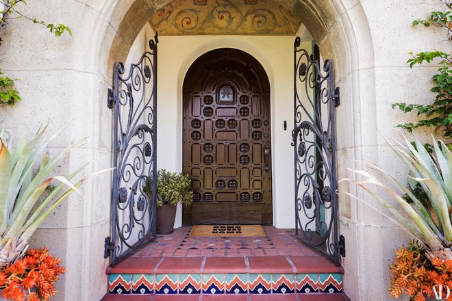 Even without stepping inside the cyan-trimmed 1928 Spanish Colonial of Jesse Tyler Ferguson and his husband, activist and social innovator Justin Mikita, one fact is crystal clear: The couple excels at the delicate art of balancing kitsch and class, their cheeky wit fusing with aesthetic prowess. It’s a mashup of informal and formal that feels cozy and intimate in a way that betrays the Loz Feliz house’s size and the could-be severity of its original Gothic-inflected interior finishes—painted ceilings, stained glass, and ornate wrought iron. Perhaps the most exemplary juxtaposition: A “Homo Sweet Homo” mat welcomes guests through the impressive arched entry vestibule.