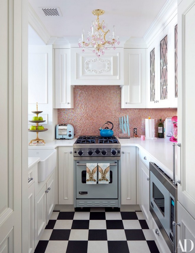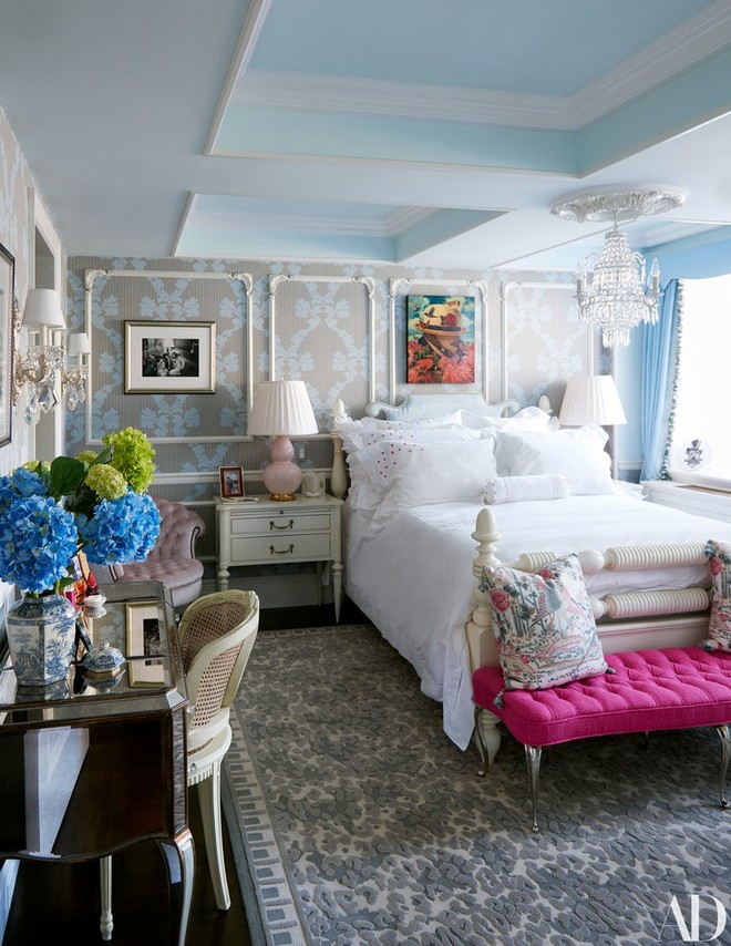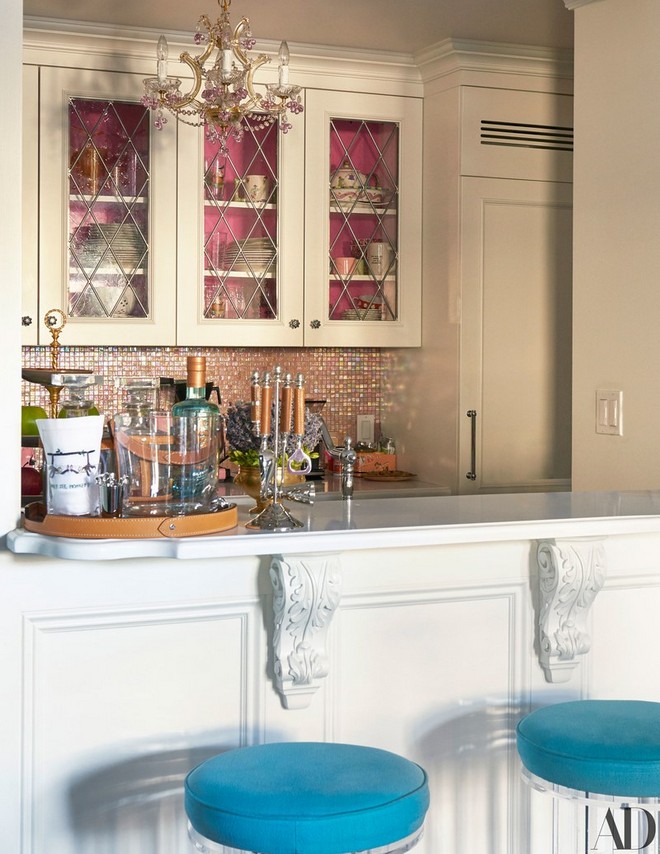 Clocking in at under 1,000 square feet, the one-bedroom, one-and-a-half bath may lack space, but it certainly makes up for it in style. It is a riot of color: In the living room, a hot pink sofa is paired with cerulean velvet wing chairs; in the kitchen, a pink mosaic backsplash, which matches the pink and gold chandelier from Capital lighting, is the centerpiece; and in the bedroom, a sky blue inset in the ceiling molding ensures even the rainiest days outdoors will still be bright inside.