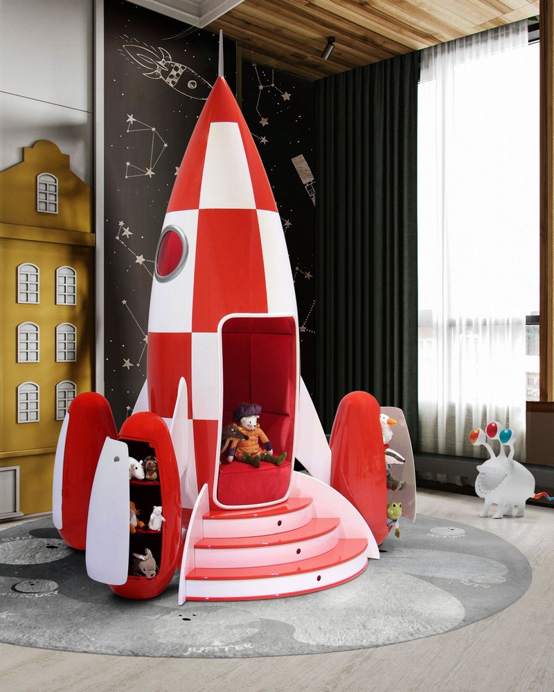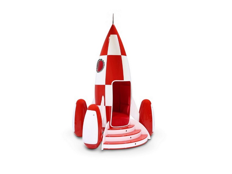 Rocky Rocket Armchair it’s a children’s interactive chair, painted in a red and white checkered pattern. The moon rocket has become an iconic symbol for kids since it began to pop up across children’s playgrounds during the 20th century and the space age era. This interactive chair features an educational light and sound system to foster curiosity and excitement among kids. It is built using top-quality materials such as wood, being robust in design and dreamy on the interiors, due to its red velvet upholstered walls and cushioned flooring.