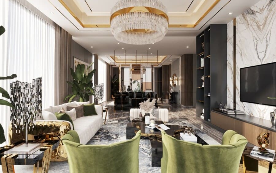 Sharing the area with generous open space for Living and Dining, this fantastically decorated living room is quite exuberant in its details. Metals were the focal point for this room, where the matching golden stripes on the walls and ceiling mix in unison with the stripes of the furniture and lighting pieces. The contemporary vibe is noticeable not only by the decoration items but in the way the furniture was carefully curated for this area.