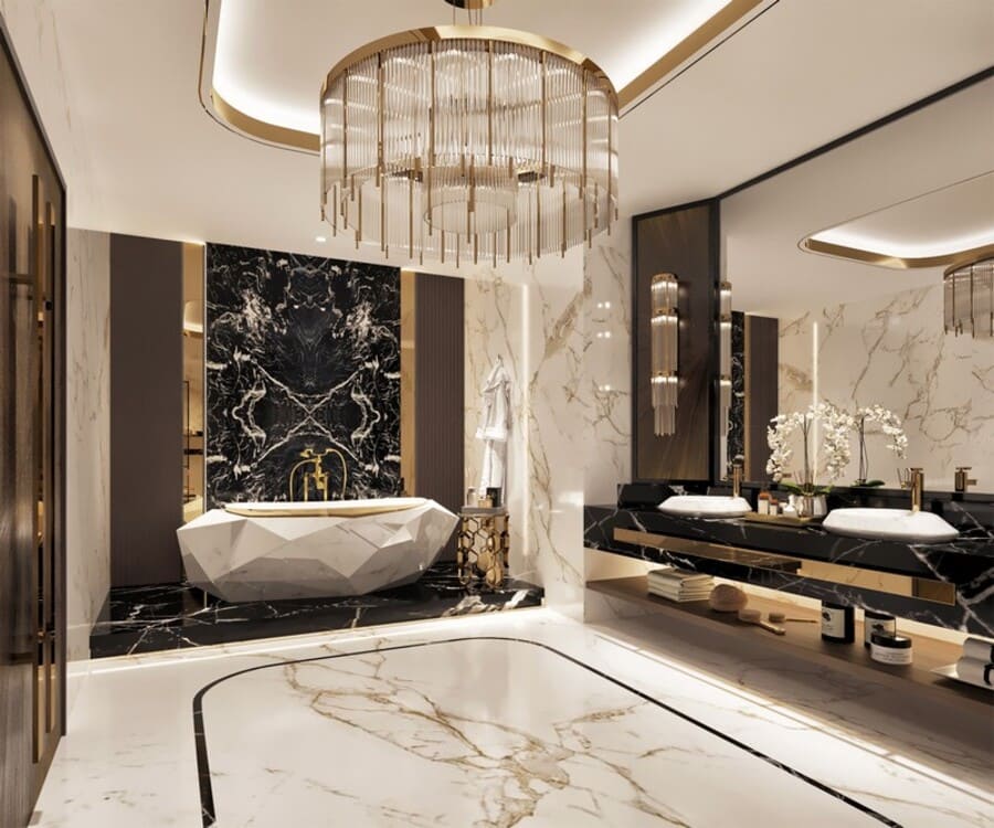 A smaller service bathroom, where the appeal is all about the tiniest elements. Gold is the main theme, exuding from all of the furniture lighting and accessory pieces.