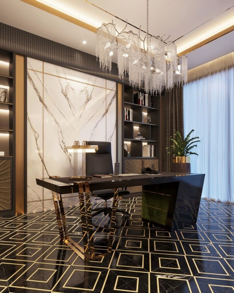 Highly professional and the perfect place for reading or creating your next screenplay, the office resembles some of the top corner offices in a skyscraper. Luxurious and masterfully decorated, this room has all the elements needed for a contemporary and rich ambiance.