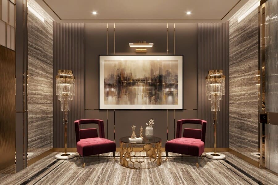 The welcoming area to this project, the foyer serves as the red carpet for the main event. Quite literally, where the ruby red velvet from the Naj Bold Armchair by Brabbu, a fully upholstered velvet armchair with nickeled nails, makes a true statement for the entryway.